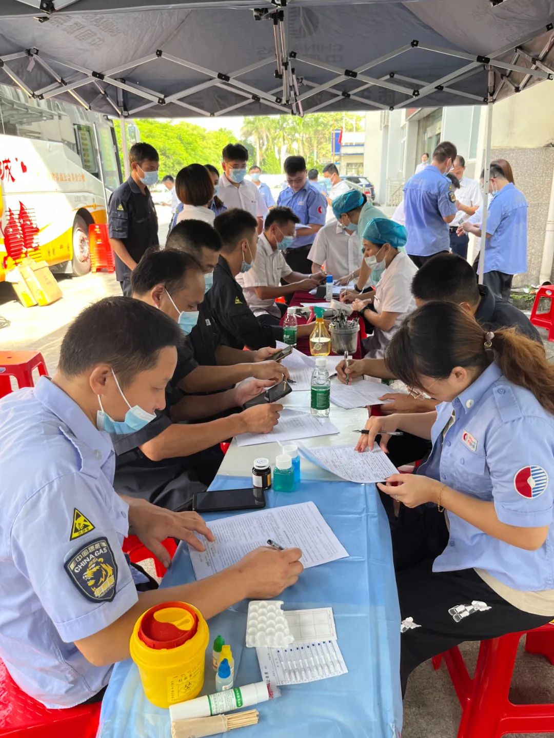 公司员工认真填写相关表格,如实报告身体健康状况,耐心地排队等候检测,虽天气炎热,但前来排队献血的员工仍络绎不绝。
